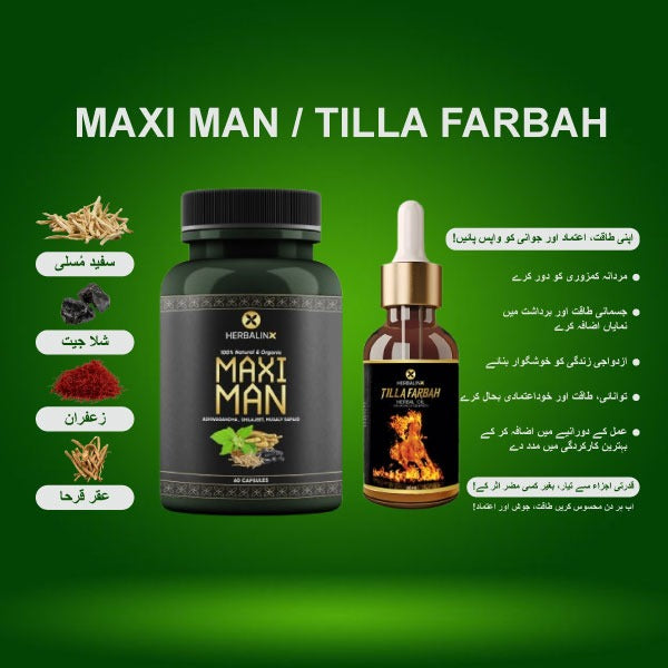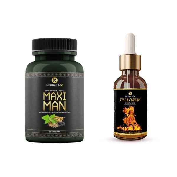 Experience the perfect combination of inner vitality and external nourishment with the Herbalinx Power Duo Pack, featuring Maxi Man Capsules and Tilla Farbah Oil. Specially formulated for men, this 100% herbal and organic combo is designed to boost energy, enhance stamina, and promote overall strength and wellness — inside and out.